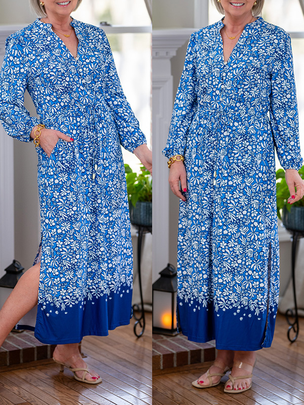 Introducing our V-Neck Printed Slit Dress, designed for the modern woman who values sophistication and style. This dress features a stunning print and elegant maxi length, making it perfect for any occasion.