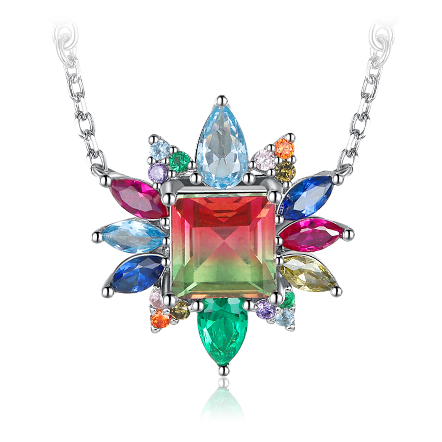Elegant and charming, this collar necklace shines with beauty from the Iridescent color collection. Crafted in 925 Sterling Silver, this exquisite choice showcases princess cut watermelon color simulated tourmaline surrounded. Radiant gemstone and a brilliant buffed luster, this collar necklace is certain to turn heads.