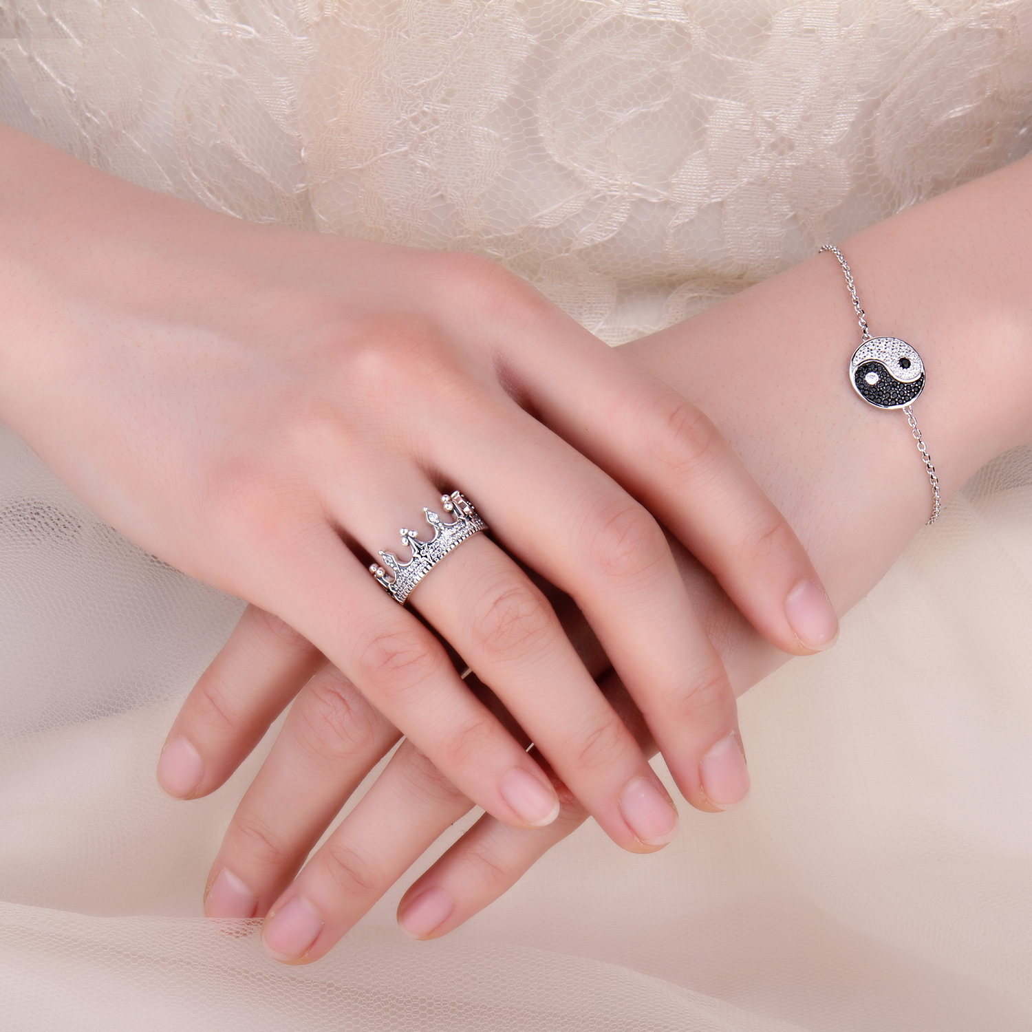 This vintage tiara crown ring features spades and diamond pattern with milgrain details, crafted in sterling silver and embellished with sparkling cubic zirconia. Worn alone or with other stackable wedding bands for a textured look, it is a classic and elegant piece for everyday wearing.