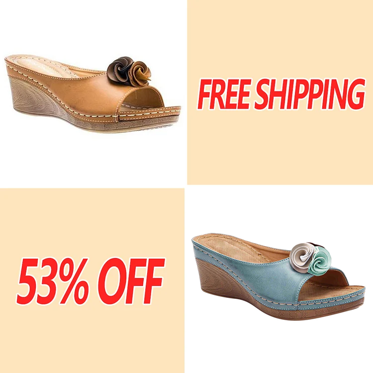 • Womens Comfy Leather Solid Flower Strap Wedge Sandals