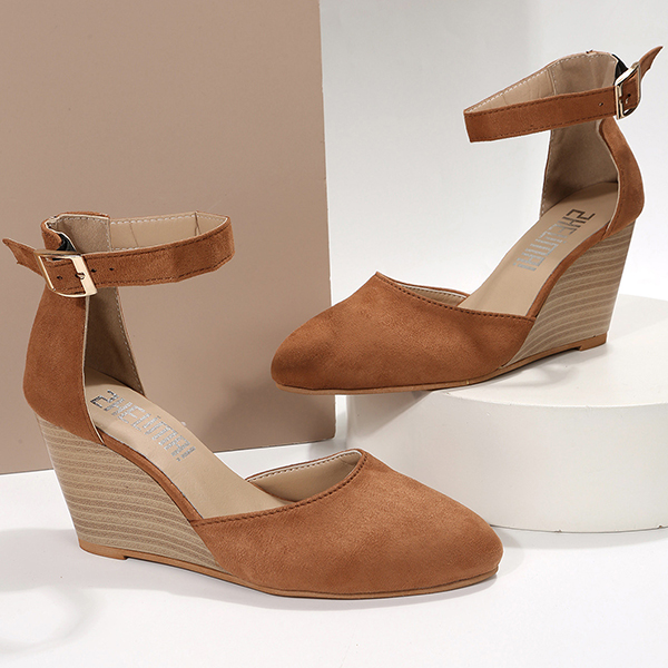 Women's Closed Toe Solid Suede Pointed Wedge Heel Thick Bottom Buckle Sandals